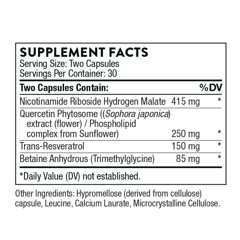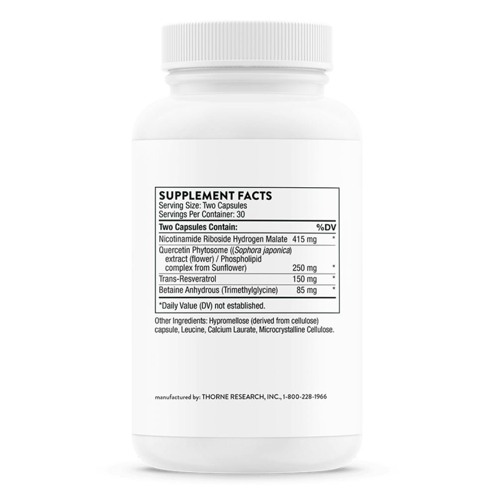 Thorne ResveraCel is designed to support cellular repair and metabolism from the inside out. By combining nicotinamide riboside hydrogen malate with three complementary ingredients, it provides a broader, more robust approach to healthy aging. Adding this to your daily routine helps support the cellular energy production that takes place in the mitochondria, offering a practical way to maintain vitality over time.